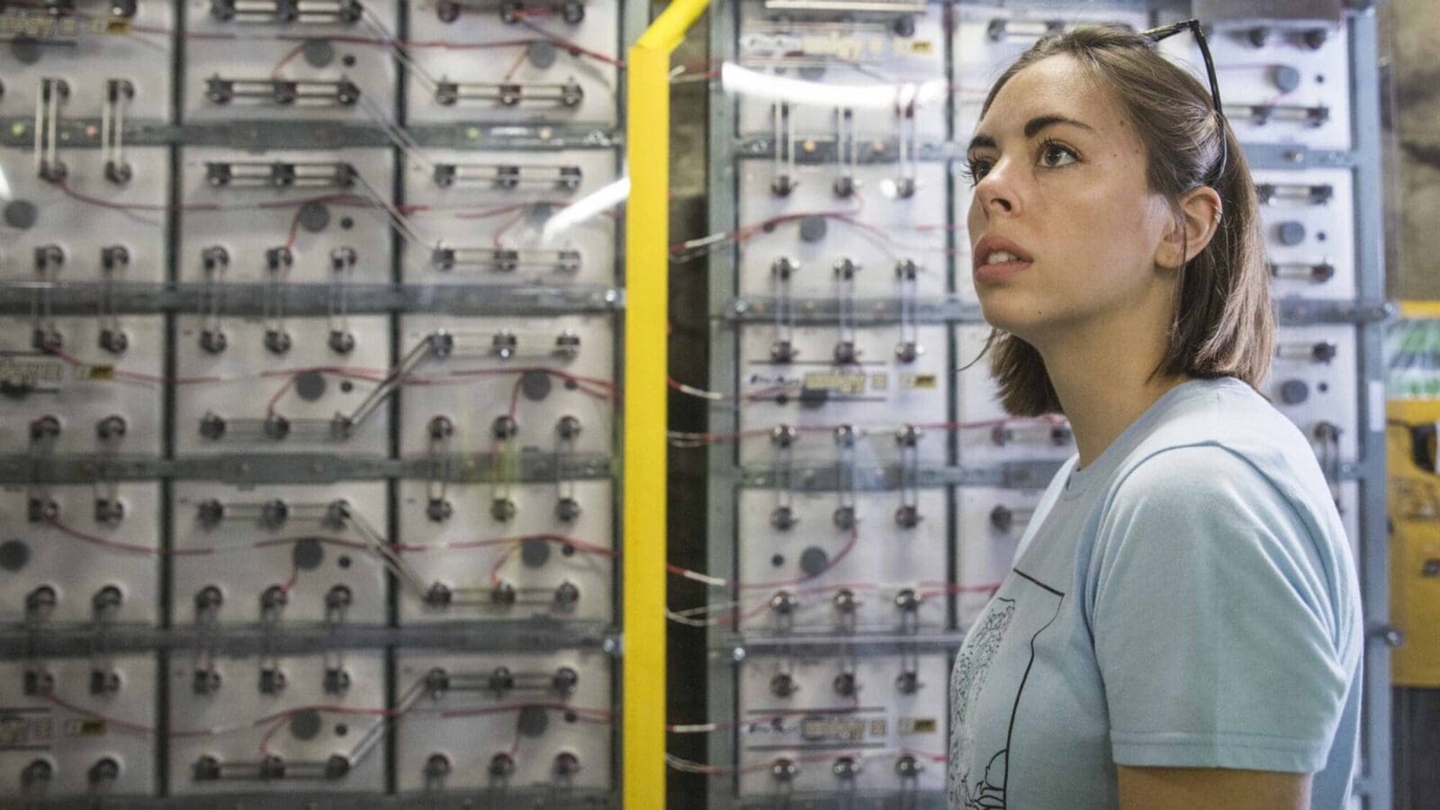 Erin Redding looks at the battery bank at Alcatraz Island. The solar energy produced by the rooftop PV system is stored in a 2 MWh battery bank on the island.