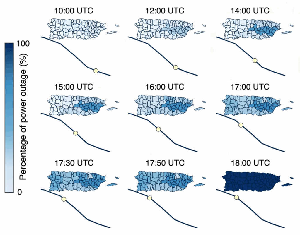Outage data reveals that just before the hurricane’s landfall, Puerto Rico’s grid went from over 50% operational to a total blackout in under 10 minutes. This sudden drop points to an event known as a cascading power failure, in which an outage in one grid component causes a chain reaction that leads the entire system to collapse.